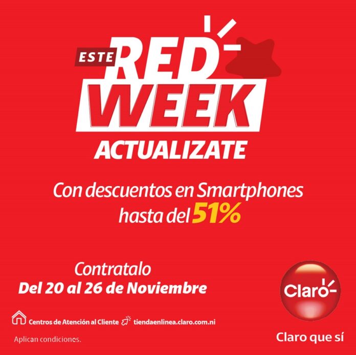 20 de noviembre de 2023/ Claro Nicaragua, empresa líder en telecomunicaciones trae grandes ofertas, para las y los nicaragüenses con el Red Week, en el que tendrán descuentos en servicios móviles y fijos, además de precios de locura en smartphone, computadoras y Smart Tv, para que en esta temporada no falte la conexión con el mejor y más rápido internet del país.