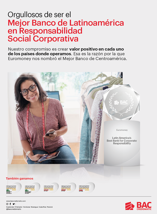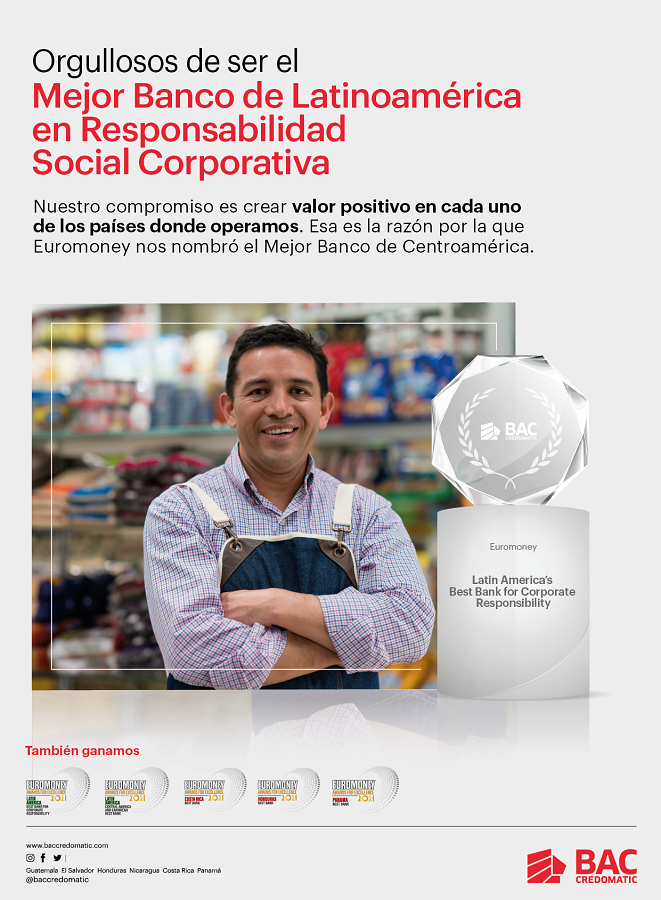 Euromoney reconoció al Grupo Financiero BAC Credomatic como “Mejor Banco en Responsabilidad Social Corporativa en Latinoamérica”, “Mejor Banco en Costa Rica”, “Mejor Banco en Honduras”, “Mejor Banco en Panamá” y por segundo año consecutivo “Mejor Banco en Centroamérica y el Caribe”.