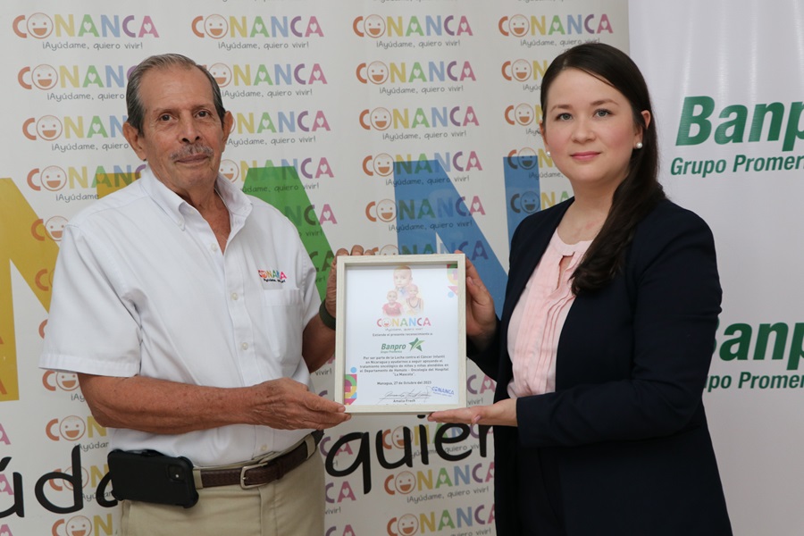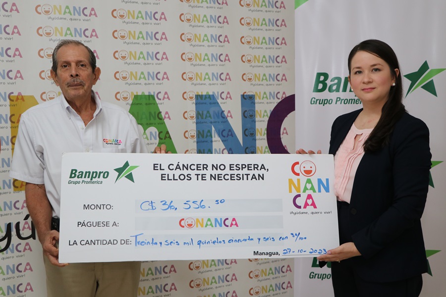 Una vez más, Banpro Grupo Promerica se une a la Comisión Nicaragüense de Ayuda al Niño con Cáncer (CONANCA), para apoyar a los pequeños que sufren este mal y que son atendidos en el hospital de referencia nacional, Manuel de Jesús Rivera, La Mascota. La licenciada Camila Cárdenas, gerente de sucursal Banpro en Metrocentro, entregó al señor José Ramón Molina, representante de CONANCA, un donativo de C$ 36,556.50 córdobas para que continúen con su labor altruista de salvar vidas. Asimismo, el señor Molina entregó a Banpro un reconocimiento por apoyar causas benéficas, en pro de las personas más vulnerables.