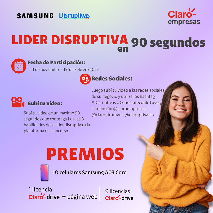 Posteriormente, las participantes deben publicar su video en las redes sociales: Instagram, Facebook y Twitter, utilizar el hashtag #ConectateConLoTuyo #Disruptiva y mencionar a @claroempresasca, @claronicaragua y @disruptivas.co. La fecha límite para aplicar al concurso es hasta el 15 de febrero 2023.