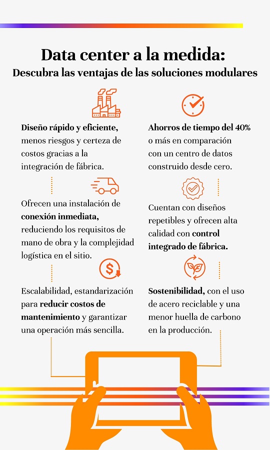 Sus ventajas incluyen un diseño rápido y eficiente, menos riesgos y certeza de costos gracias a la integración de fábrica. Las soluciones modulares de data center son escalables para ampliaciones futuras, cuentan con diseños repetibles y ofrecen una alta calidad con la posibilidad del control integrado de fábrica. Este montaje sencillo permite enviar los módulos rápidamente por carretera, ferrocarril o vía marítima.