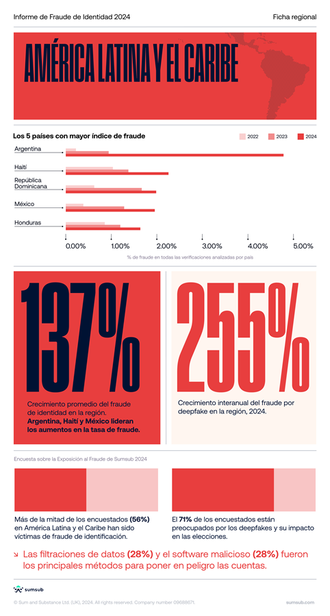 • En América Latina y el Caribe, la tasa media de crecimiento interanual del fraude por deepfakes es del 255%. Los 5 países que lideran este crecimiento son México (350%), Brasil (630%), Haití (600%), Venezuela (344%) y Argentina (279%).