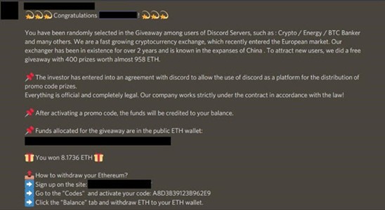Estafas de criptomonedas: Los cibercriminales los utilizan para invitar a los usuarios a ingresar en enlaces que suplantan la identidad de compañías que usan a las criptomonedas como medio de transferencia, ofreciendo un pequeño premio en la criptodivisa correspondiente y que para poderlo hacer válido es necesario registrarse en el enlace adjunto.