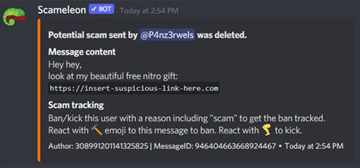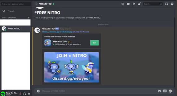 En la primera se emplean los bots de Discord, donde se envían mensajes masivos a los usuarios de forma aleatoria -o bien se agregan mensajes públicos a un canal o servidor- a partir de los cuales los usuarios pueden conseguir una suscripción gratuita a Nitro. Las víctimas entran a un enlace de tipo phishing que las lleva a una página de inicio de sesión falsa. Una vez que inician sesión a través de esta página, los estafadores se apropian de todos los datos introducidos como pueden ser credenciales, información de la cuenta en Discord, incluso dinero.