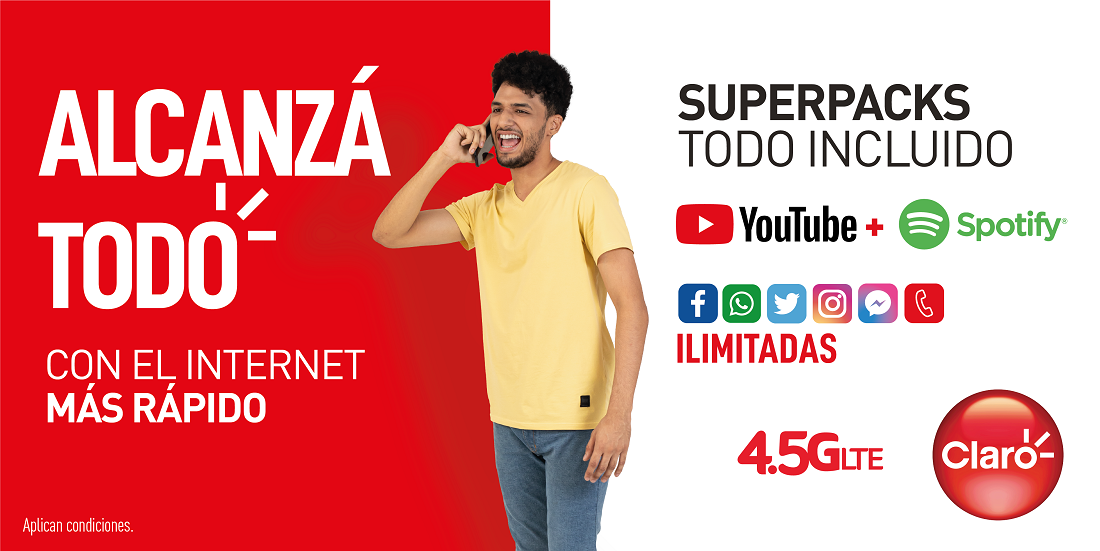 Para los usuarios Prepago, Claro pone a disposición los “SuperPacks Todo Incluido” con YouTube + Spotify GRATIS, disponibles desde los C$70 córdobas. Incluyen hasta 10 gigas de navegación, redes sociales gratis como Facebook, WhatsApp, Messenger, Instagram, Twitter y llamadas ILIMITADAS.