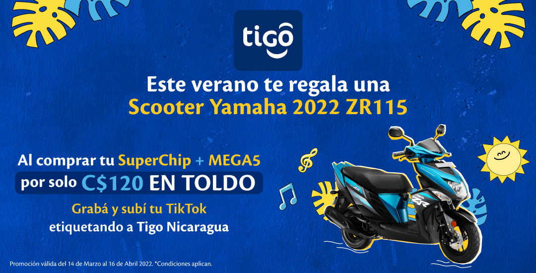 Los clientes que visiten y activen un servicio en el Toldo Veranero Tigo podrán participar en la rifa de una “Scooter Yamaha 2022 ZR 115”. Participan de la promoción todos los clientes que adquieran en el Toldo un Megapacks desde C$70, contraten un plan pospago #SiempreConectado o un plan Tigo Hogar. Adicional, los clientes deben grabar un video creativo en el stand y subirlo a Tiktok etiquetando la cuenta oficial de Tigo Nicaragua y usando los Hashtags #MeQuedoConTigo y #VeranoTigo.