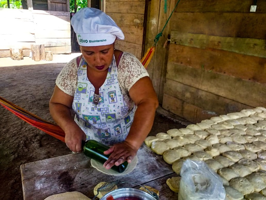 Entre los productos típicos nicaragüenses que elabora están las rosquillas, el bollo dulce, tortilla dulce de maíz (hojaldras), pan de barra, empanadas rellenas de queso; todo lo vende a C$7.00 la unidad (menos de U$0.20), a pesar de que los insumos como la harina, el queso y el azúcar están caros y debe mandarlos a traer a San Carlos (34 km).