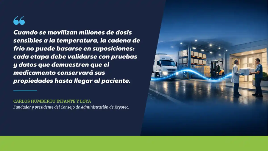 «Cuando se movilizan millones de dosis sensibles a la temperatura, la cadena de frío no puede basarse en suposiciones: cada etapa debe validarse con pruebas y datos que demuestren que el medicamento conservará sus propiedades hasta llegar al paciente», señala Carlos Humberto Infante y Loya, fundador y presidente del Consejo de Administración de Kryotec.