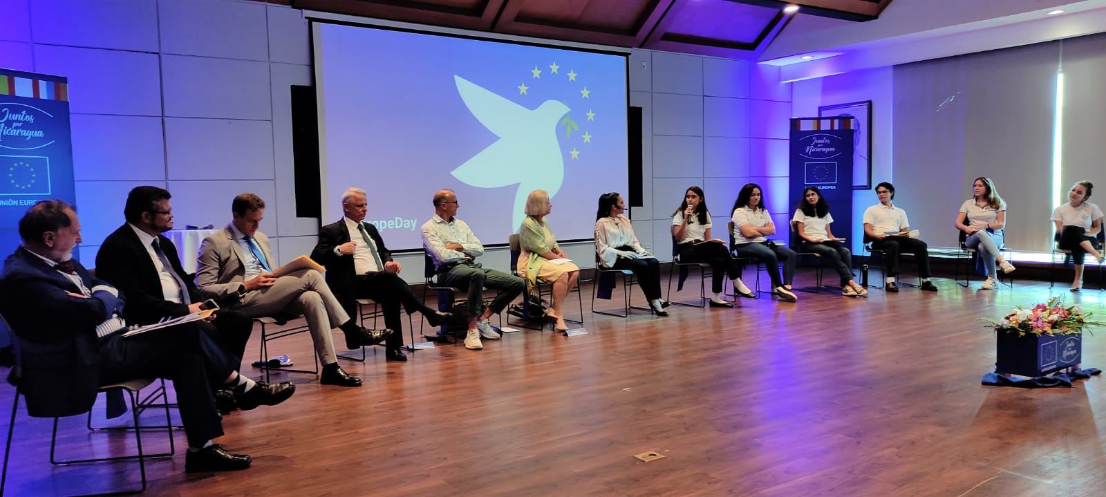 Representantes de la Delegación de la Unión Europea y las embajadas de sus Estados Miembros en Nicaragua y estudiantes de último año de secundaria participaron en el panel “La Unión en la Diversidad frente a los desafíos y oportunidades del mundo contemporáneo”, organizado en el marco de la conmemoración del Mes de Europa y el Año Europeo de la Juventud.