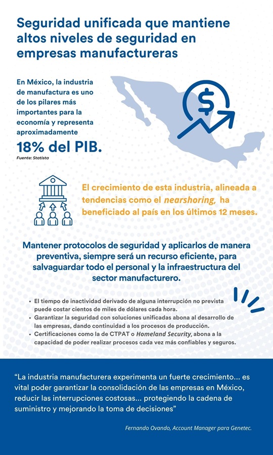 Es por esto que para Genetec Inc., empresa que provee tecnología de seguridad unificada, aplicable para sectores de seguridad pública, operaciones e inteligencia de negocios, mantener la continuidad en los procesos del sector de manufactura, se vuelve un elemento clave ya que la interrupción de los mismos, puede derivar en pérdidas millonarias para las empresas.