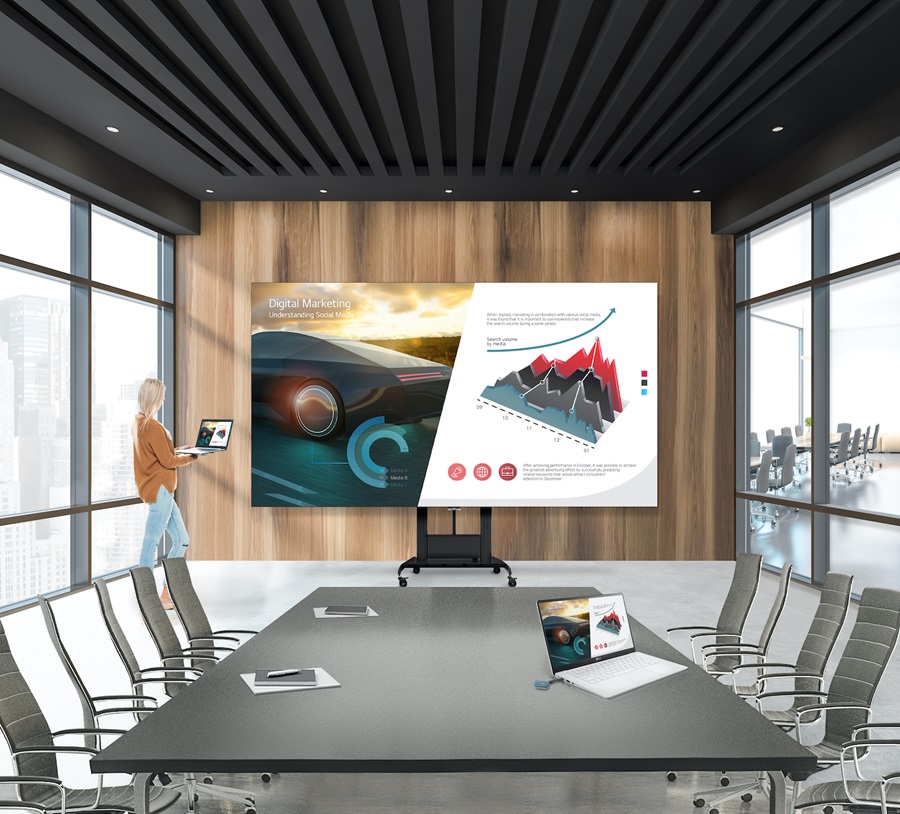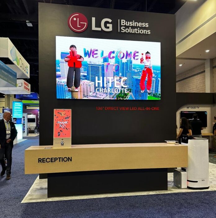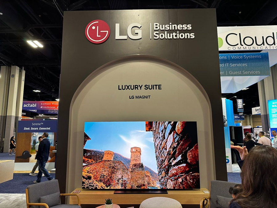 LG destaca varias pantallas digitales optimizadas para zonas públicas de hoteles, incluida una pantalla DVLED (diodo emisor de luz de visión directa) todo en uno de 136 pulgadas que se puede instalar en un solo día y una pantalla One:Quick Works todo en uno de 55 pulgadas para conferencias y uso compartido de pantalla, ideal para salas de reuniones o como pantalla de orientación en el lobby.